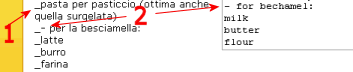 L'inizio delle voci di una lista è contrassegnato da un trattino basso (1) per evitare che si confondano con le altre parole andate a capo a causa della loro lunghezza. Questo trattino NON deve essere riportato nella lista tradotta. Inoltre per consentire la formattazione automatica dei capoversi è presente un trattino (il segno meno) che deve essere riportato anche nella traduzione (2).
